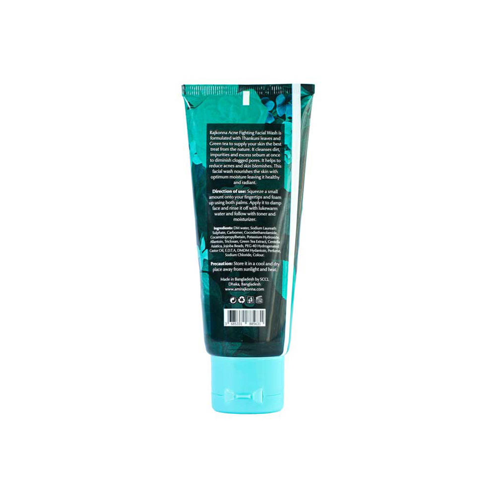 Rajkonna Acne Fighting Facial Wash is formulated with Thankuni leaves and Green Tea to supply your skin the best treat from the nature. It comes with jojoba beads, helps to clean dirt, impurities and excess sebum at once to diminish clogged pores.It helps to reduce acnes and skin blemishes. This facial wash nourishes the skin with optimum moisture leaving it healthy and radiant. Perfect for oily to combination skin.